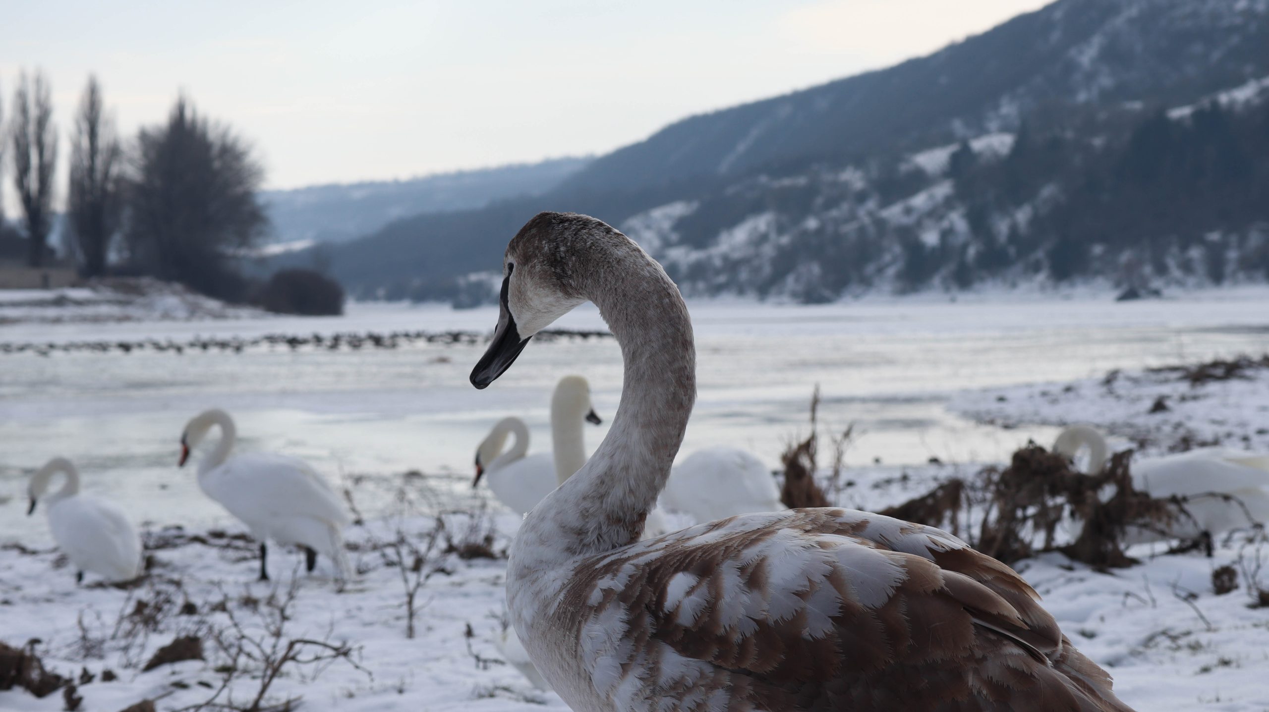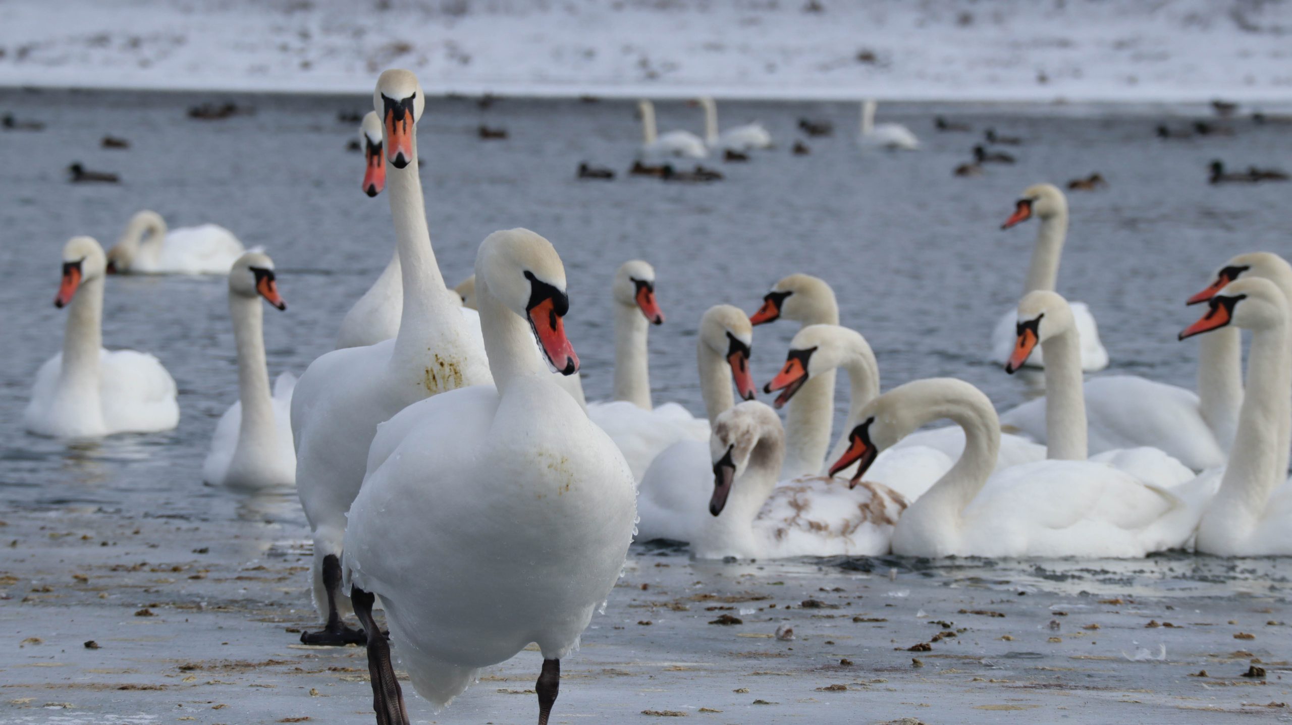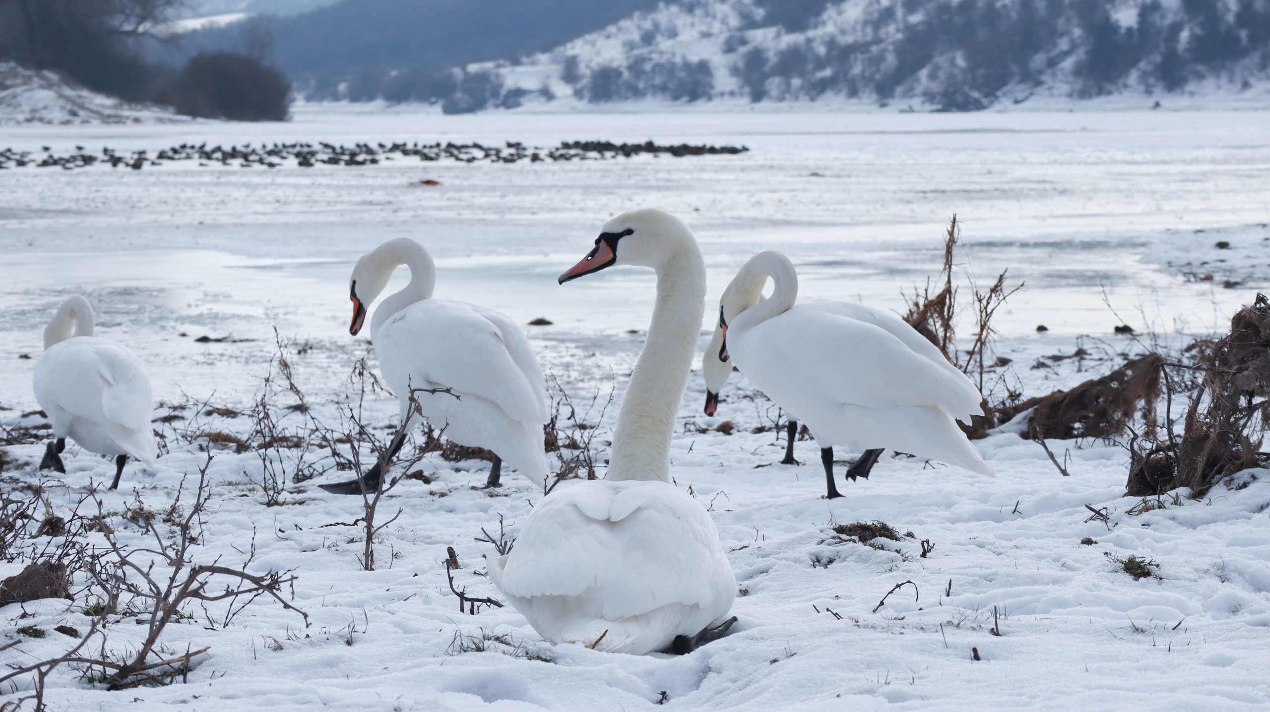 În fotografii pot fi observate mai multe lebede, cât și rațe sălbatice, care se odihnesc și se hrănesc pe luciul apei.