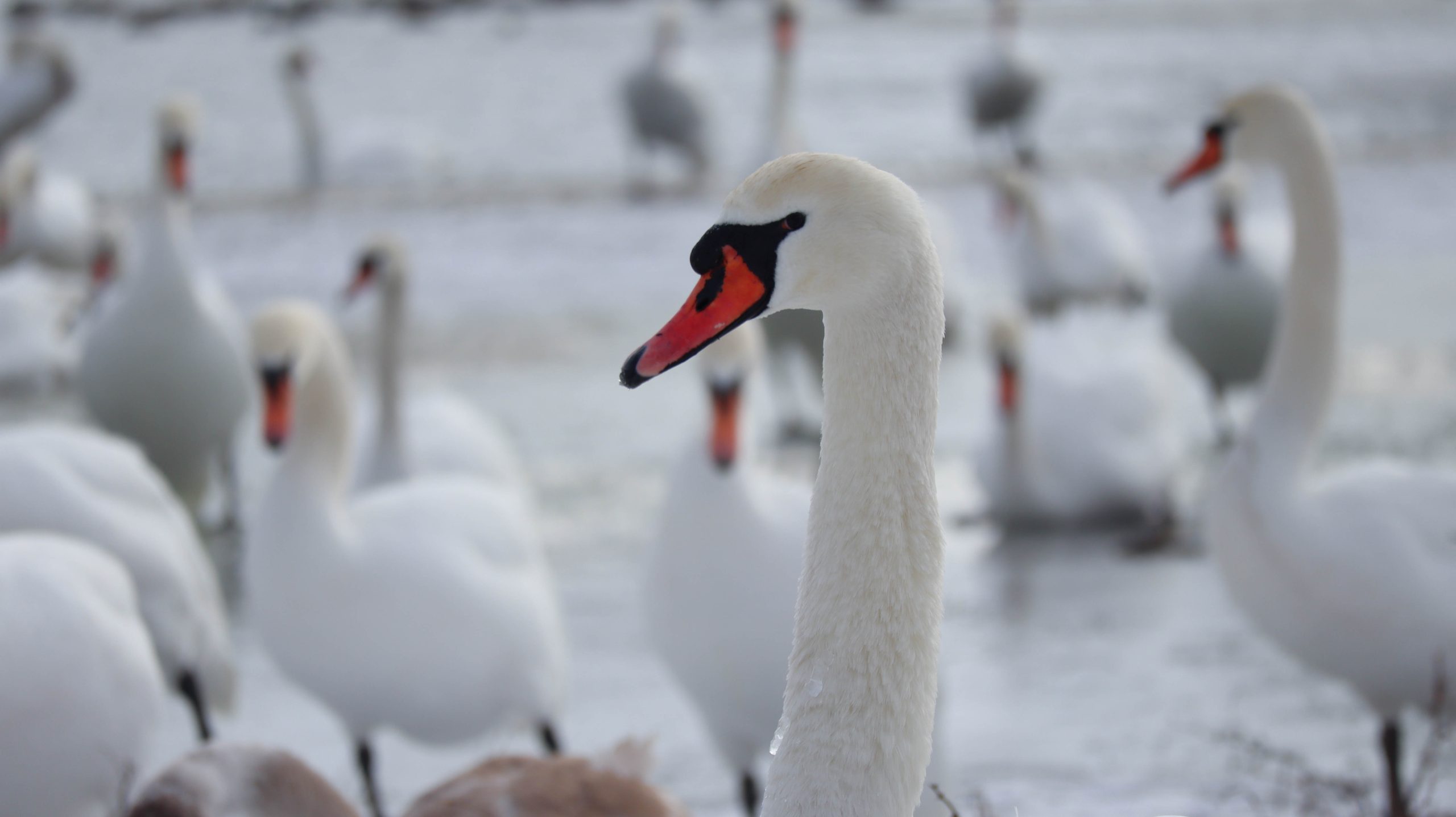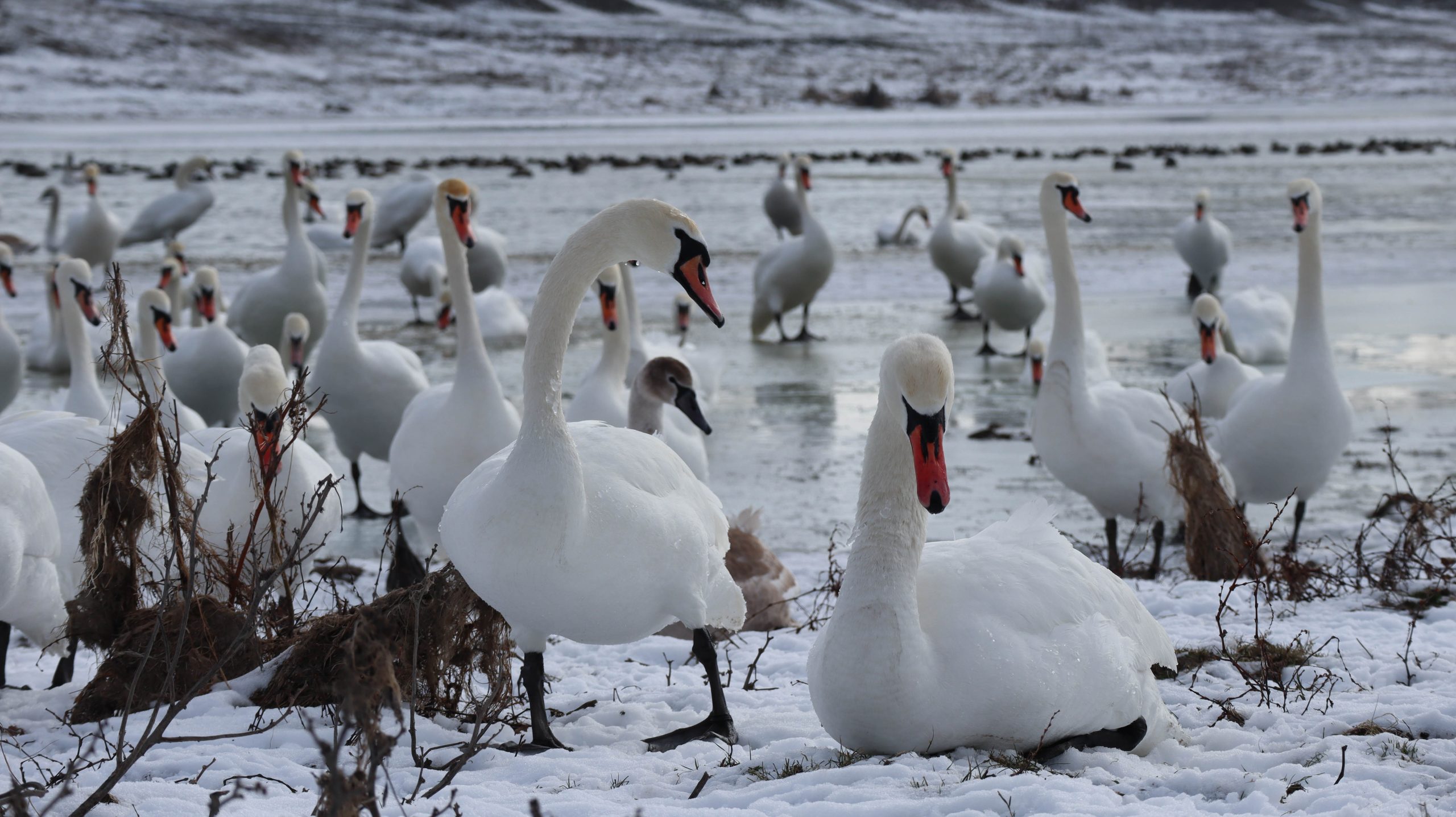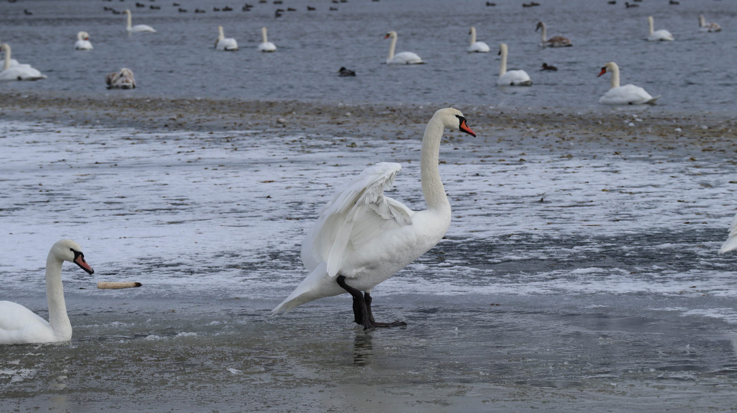 În fotografii pot fi observate mai multe lebede, cât și rațe sălbatice, care se odihnesc și se hrănesc pe luciul apei.