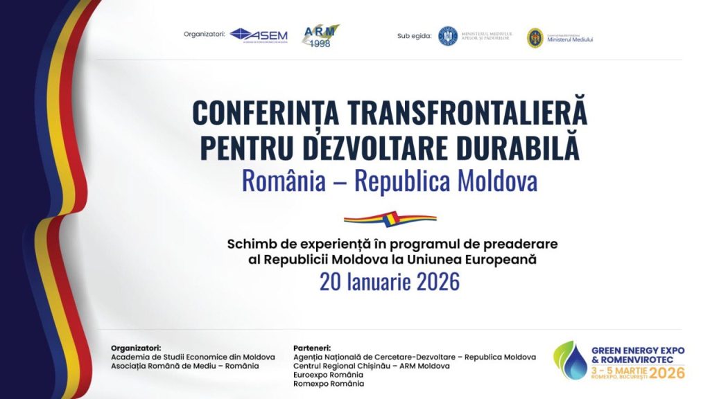 Discuțiile pe platformă de cooperare și dialog instituțional, menită să sprijine identificarea de soluții aplicabile pentru tranziția verde și dezvoltarea durabilă a Republicii Moldova, vor continua la București, în martie, la Conferința Transfrontalieră România – Republica Moldova (varianta extinsă), organizată în cadrul Green Energy Expo & Romenvirotec.