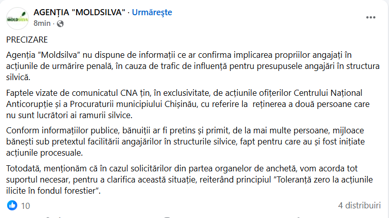 Agenția „Moldsilva” a venit cu o precizare pe pagina sa oficială de Facebook, în care afirmă că nu deține informații care să confirme implicarea propriilor angajați în cauza investigată de CNA.
